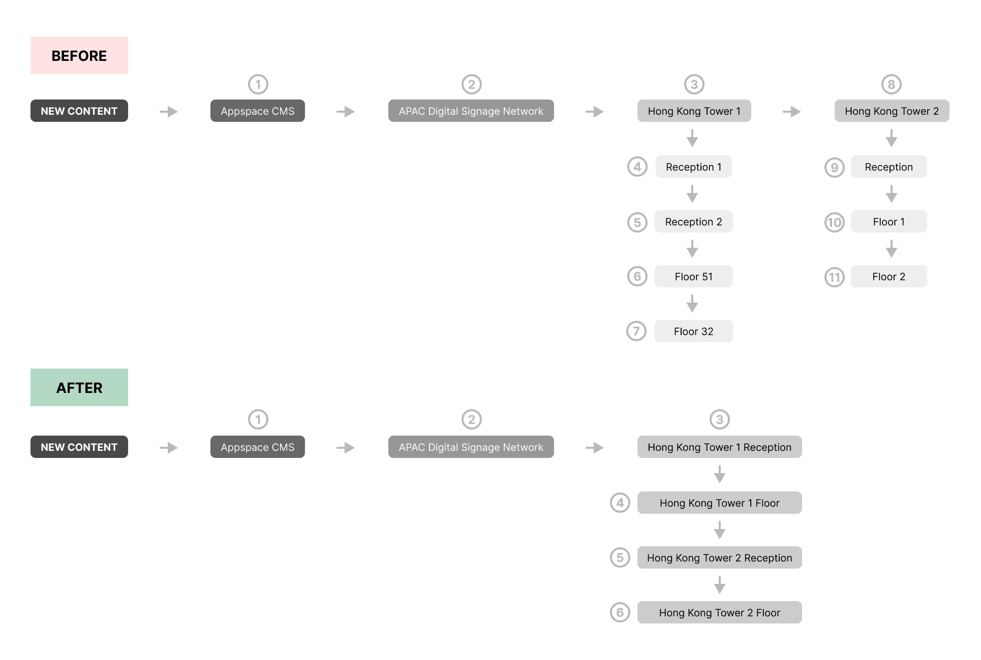 A 2-person motion design team needed to produce and publish content for 150+ digital signage screens across 12 countries. The existing workflow on the third-party platform required 10+ steps to publish each piece, creating bottlenecks. Content requests ranged from standard formats to complex explainer videos, each requiring custom design work.